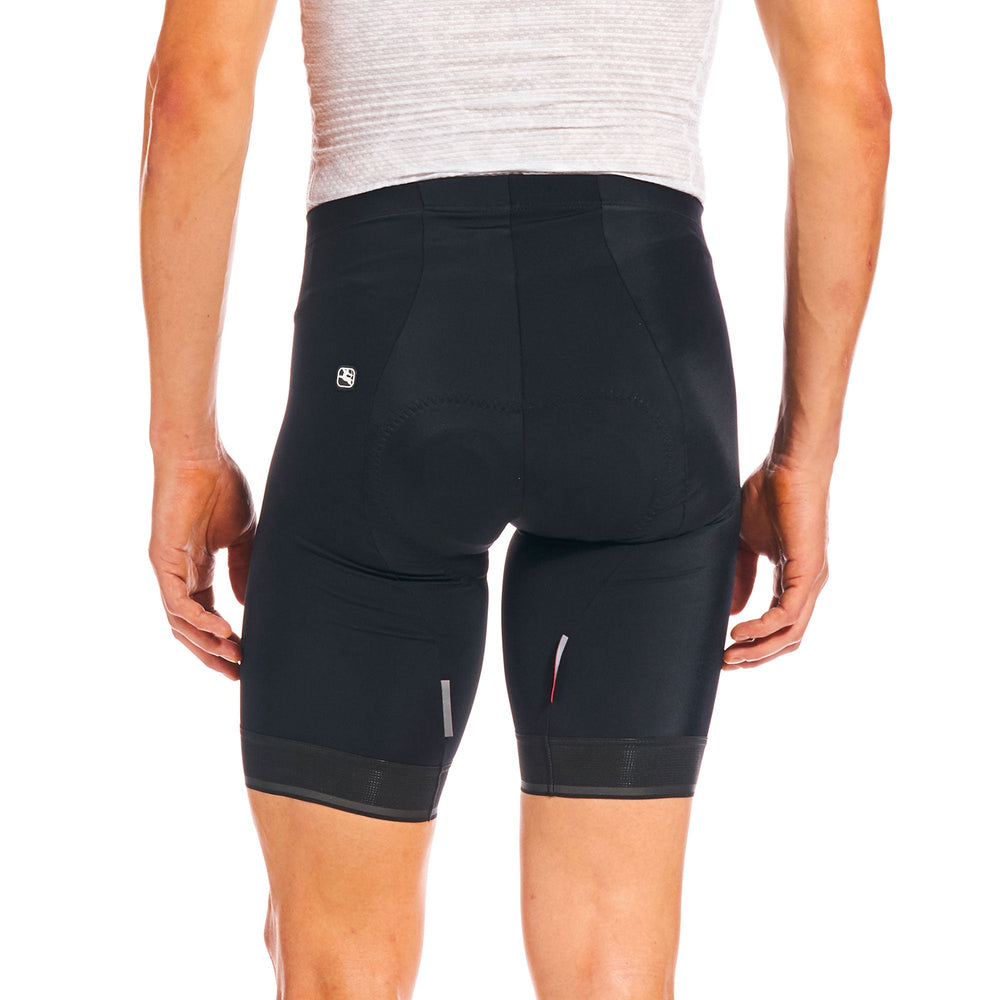 LoPro 45™: wide soft elastic leg cuffs with subtle logo treatment and silicone gripper on the inside keep the short in place while remaining non-restrictive. The bib short is richly finished with Giordana rubber logo, reflective accents on both legs, and includes the Giordana Cirro chamois.