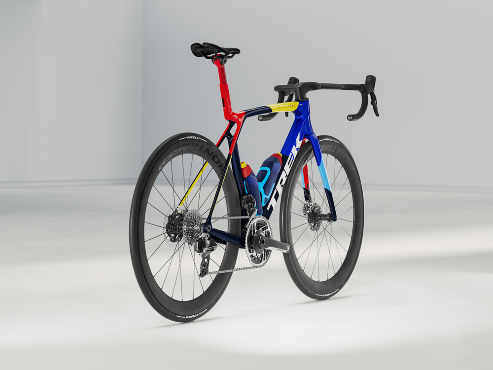 An insanely light frame made of our highest-level 900 Series OCLV Carbon with aero tubing and IsoFlow comfort technology, and RSL Aero Bottles and Cages that save watts. A 2x12 previous generation SRAM RED AXS wireless electronic drivetrain with a power meter for getting more out of training. A universal derailleur hanger so you can get a replacement anywhere. Plus, it's topped off with Bontrager Aeolus Pro 51 tubeless carbon wheels and a Trek Aero RSL one-piece bar/stem.